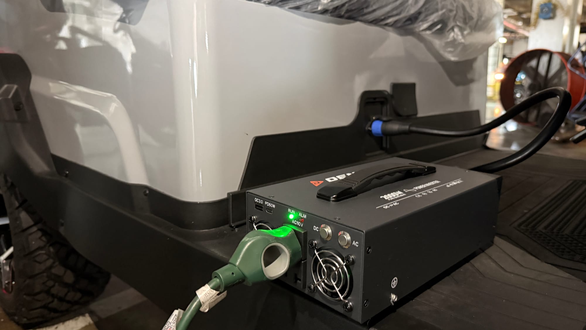 The Denago 2000W External Inverter (42–58.4V DC input) converts your cart’s 51.2V LiFePO4 battery into a portable power station. Here’s what that means in plain English: