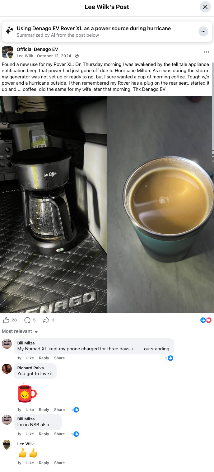 But the story that really says it all came from one of our owners. On October 12, 2024, a Rover XL owner named Lee Wilk posted this on Facebook after Hurricane Milton knocked out power to his home: